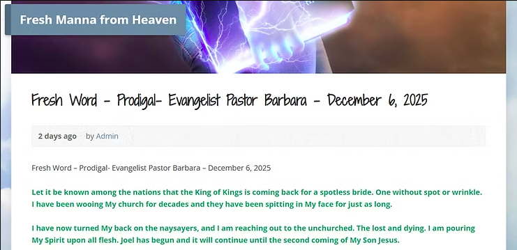 In the December 7, 2025 Sun Pm service another prophecy about “Prodigals” was given by Evangelist/Pastor Barbara Lynch Click Here to Watch. Veiled in secrecy is the notion that she is speaking in code to her love "Aaron Betz". You can hear it in the way that she talks about the “Prodigals” that she somehow has twisted it in her mind that this is a private message of her longing for her one, true love to return home to her. She recently admitted that God told her He needed her to work on her love walk (to Listen Click Here). She took this to mean that she needed to go deeper in the love that she carries for Aaron. Why? So, promises would be fulfilled that she and Aaron could go forth together to do the "Greater Works" for the Father.